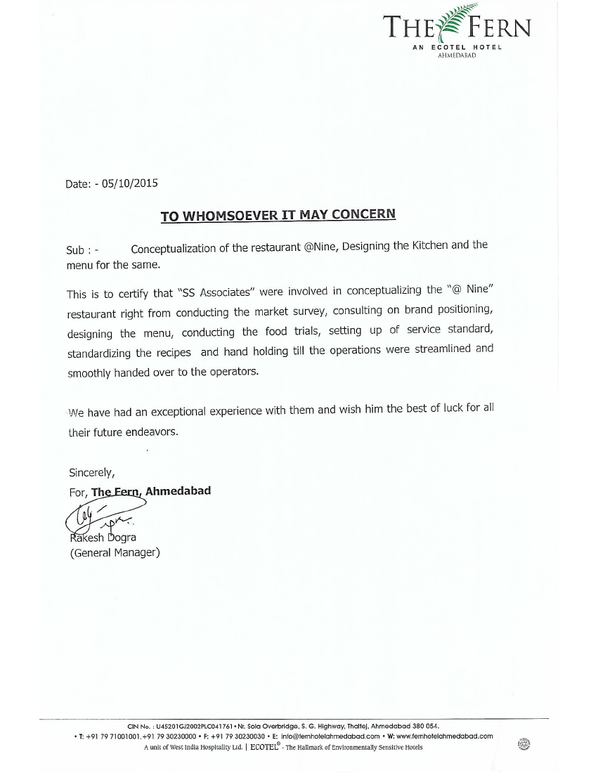 Restauant Consulting For Fern Hotel, @9 Restaurant